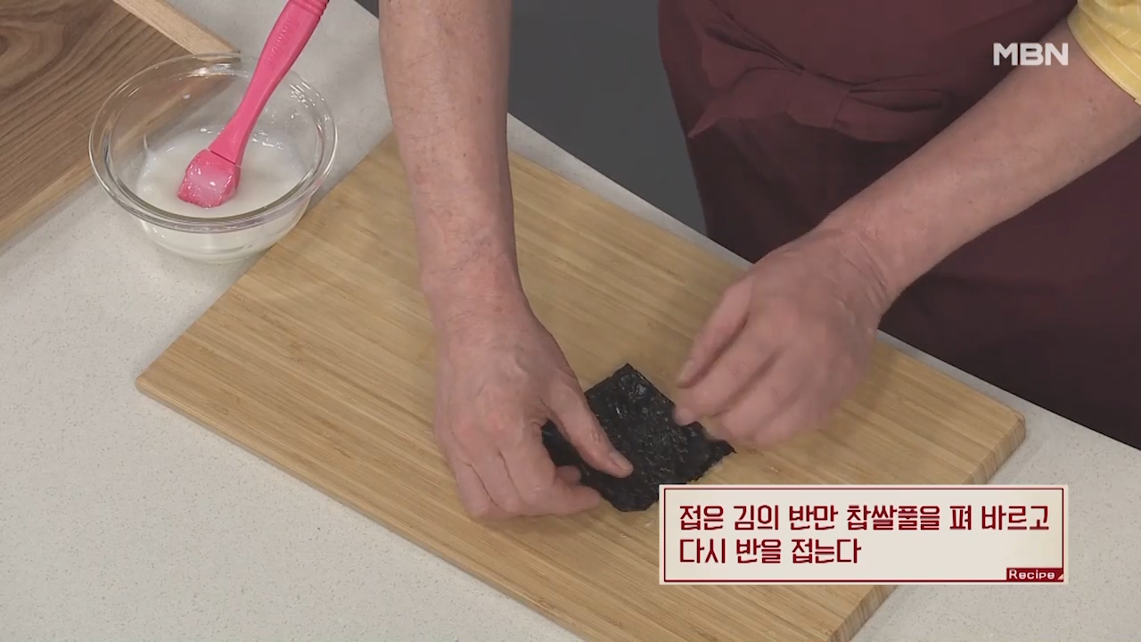▶접은 김의 반만 찹쌀풀을 펴 다르고 다시 반을 접어줍니다.