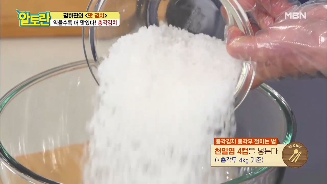 ▶천일염 4컵을 넣어줍니다. 총각무 4kg 기준입니다.