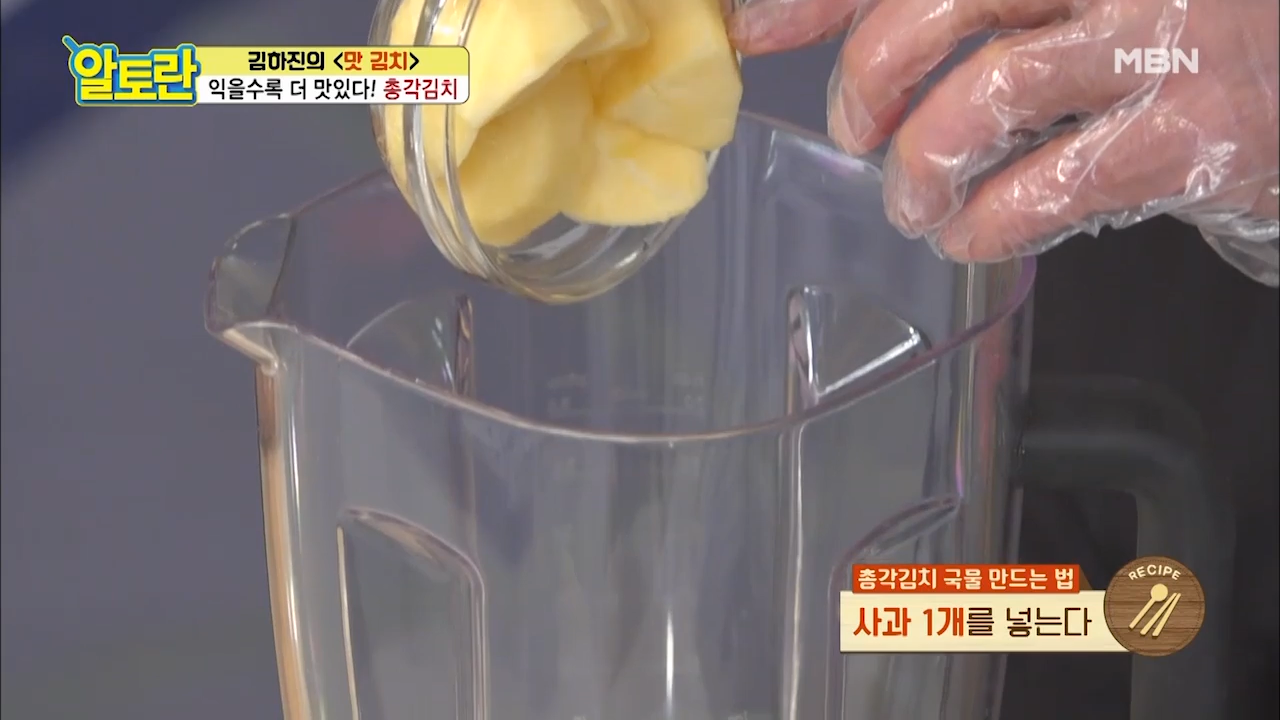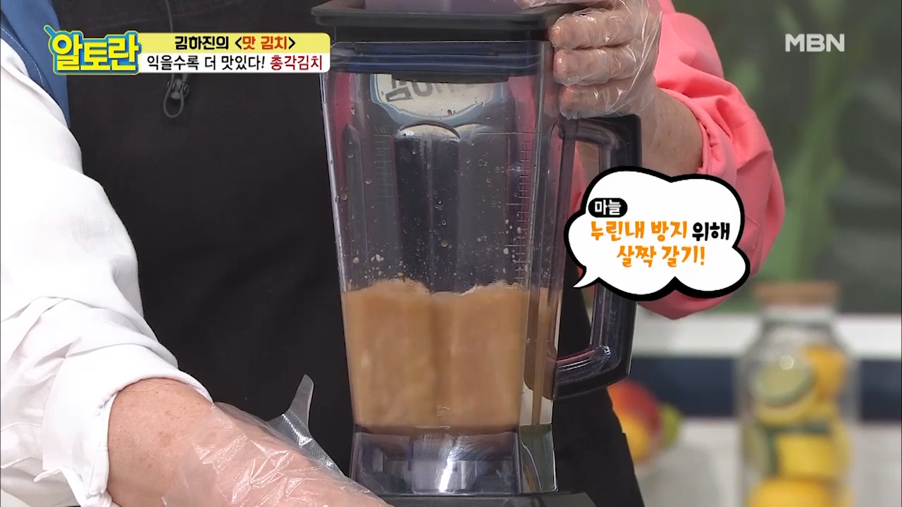 ※천연의 단맛을 내기 위해 양념에 각종 과일을 활용합니다. 양념 재료와 과일을 함께 갈지 않은 이유는 총각김치 양념에 과즙만 넣기 때문입니다.