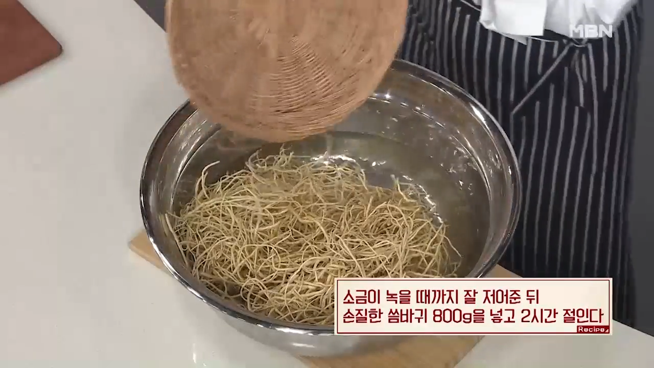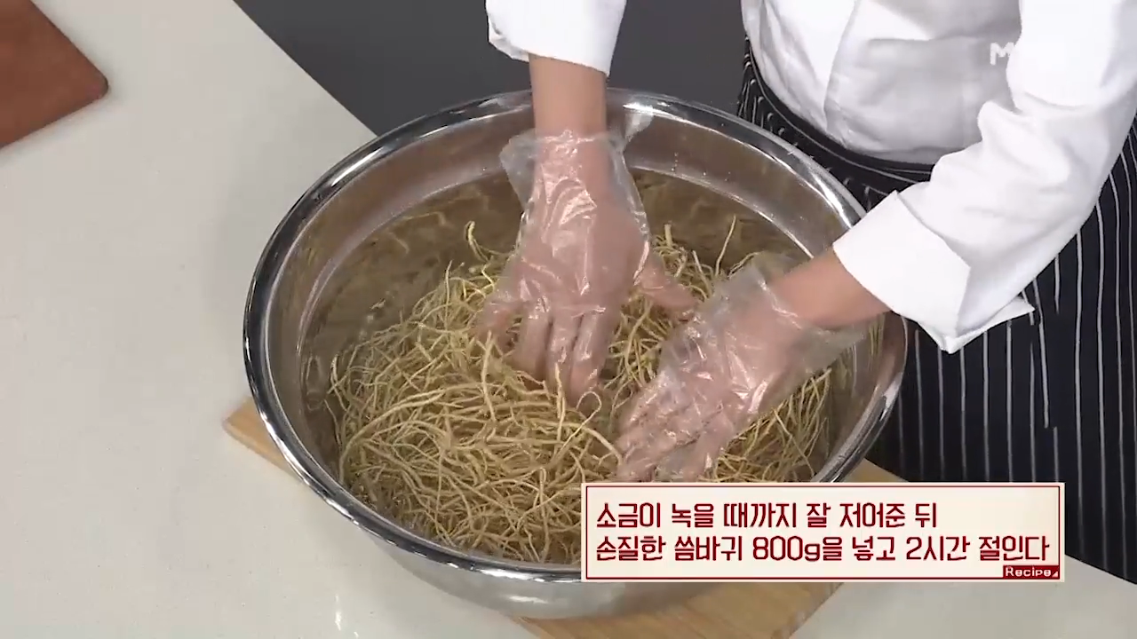 ▶소금이 녹을 때까지 잘 저어준 뒤 손질한 씀바귀 800g을 넣어줍니다.