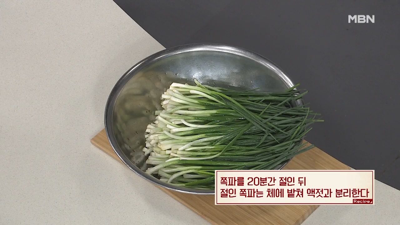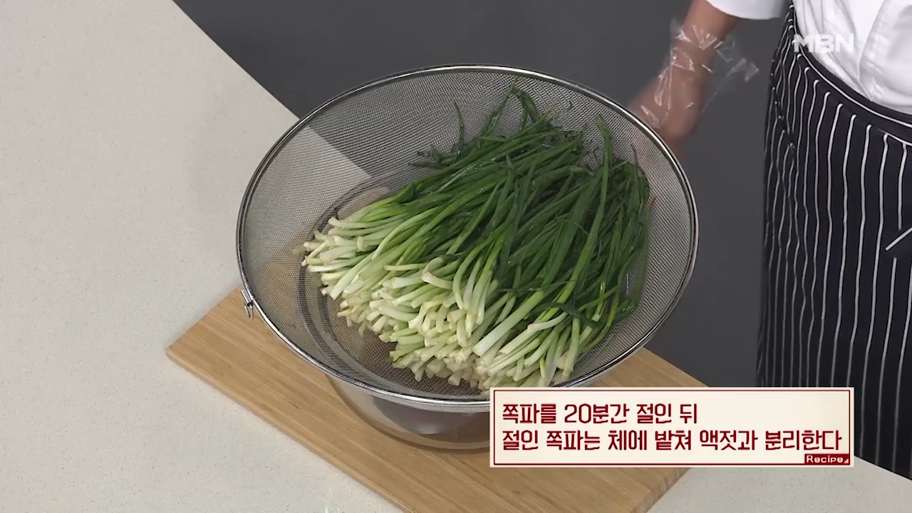 ▶쪽파를 20분간 절인 뒤 절인 쪽파는 체에 밭쳐 액젓과 분리해줍니다.