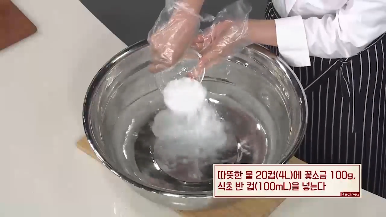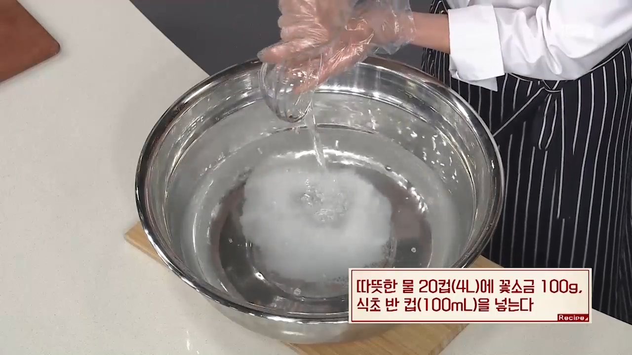 ▶따뜻한 물 20컵(4L)에 꽃소금 100g, 식초 반 컵(100mL)을 넣어줍니다.
