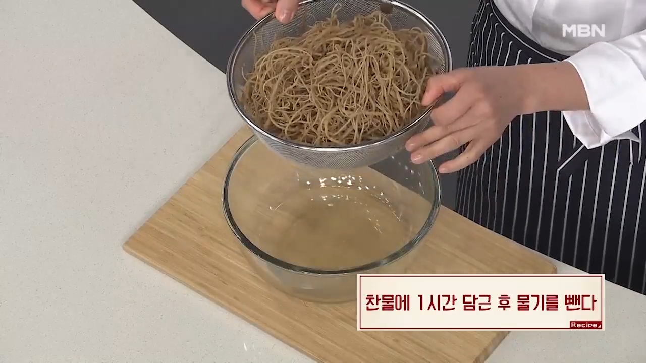 ▶주물러 씻은 씀바귀의 물기를 꽉 짜낸 후 찬물에 1시간 동안 담가줍니다.
