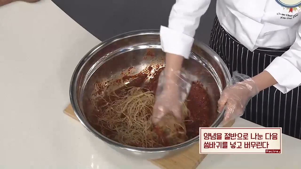 ▶양념을 절반으로 나눈 다음 씀바귀를 넣고 버무려 줍니다.