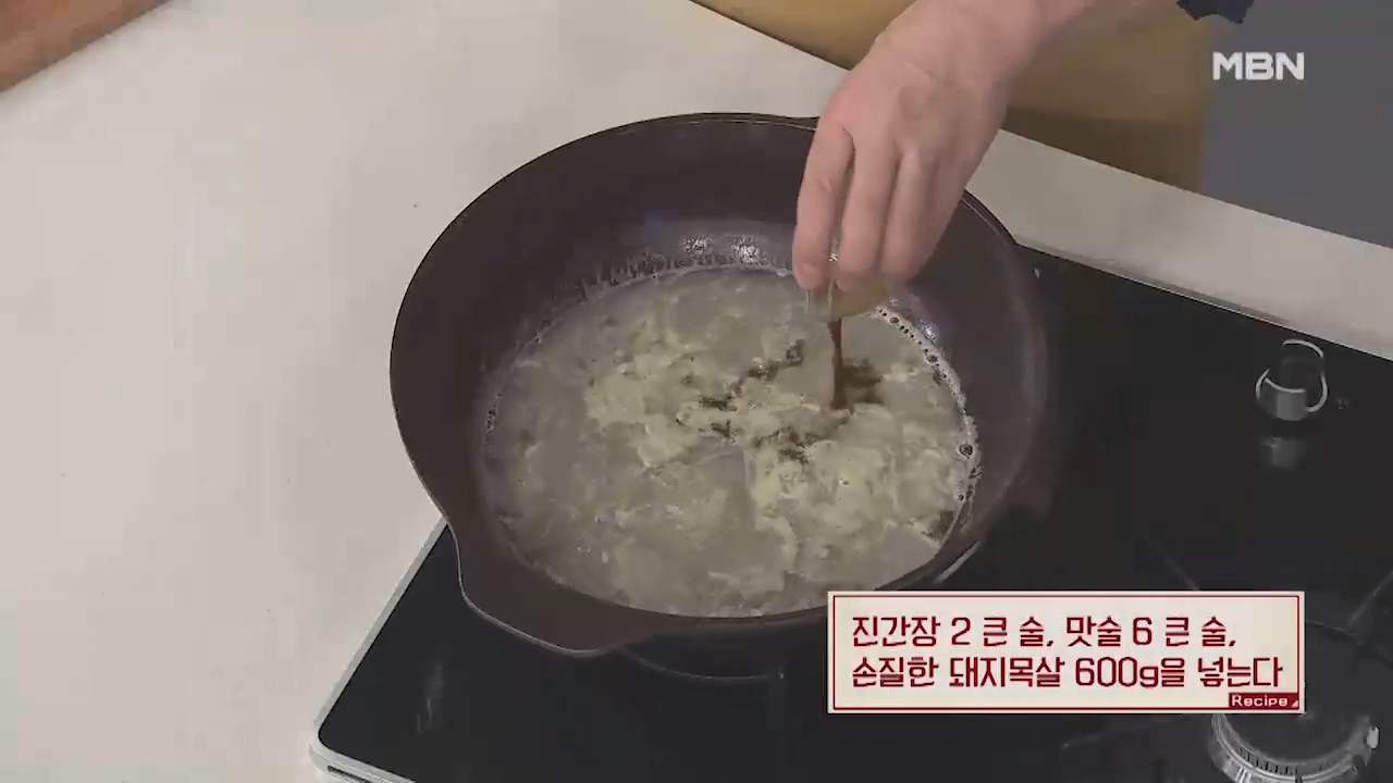 ▶맛술 6 큰 술을 넣어줍니다. 맛술을 넣어 돼지고기의 잡내를 잡아 줍니다.