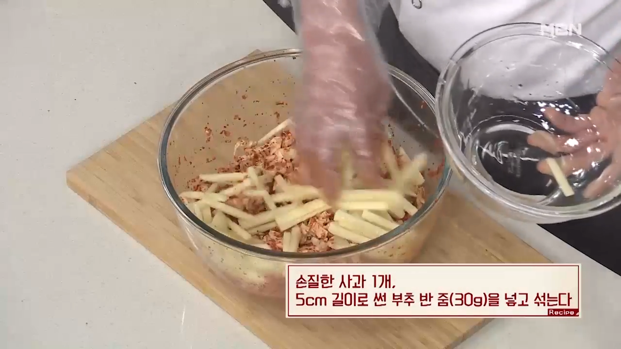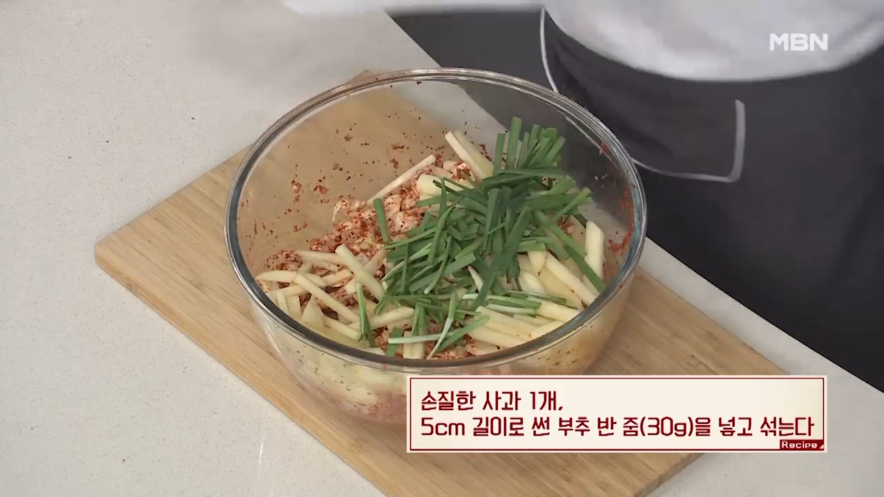 ※채 썬 사과와 부추를 양념한 후에 넣는 이유는 양념을 한 이후에 넣어야 모양과 식감이 유지되기 때문입니다.