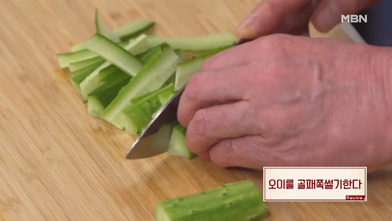 ▶오이를 골패쪽썰기(직사각형모양)으로 썰어줍니다.
