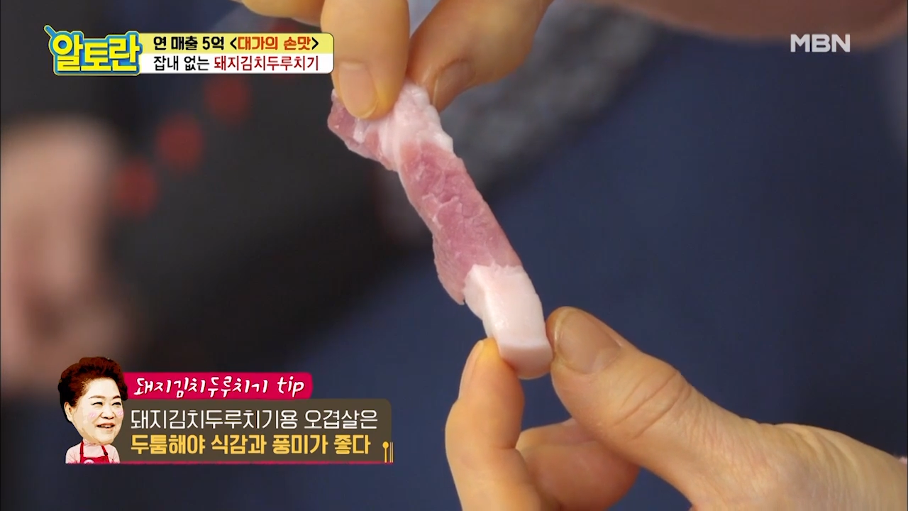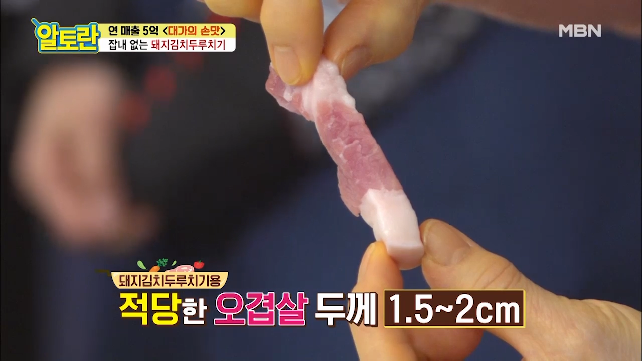 ※돼지김치두루치기용 오겹살은 두툼해야 식감과 풍미가 좋습니다. 돼지고기를 얇게 썰 경우 식감이 부족해지고 육즙이 빠져나가게 됩니다.