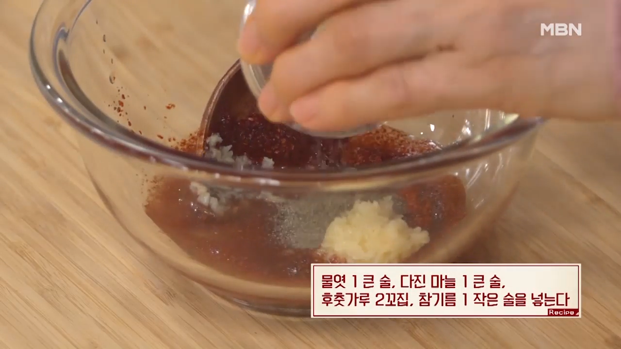 ② 물엿, 다진 마늘, 후춧가루, 참기름 넣기