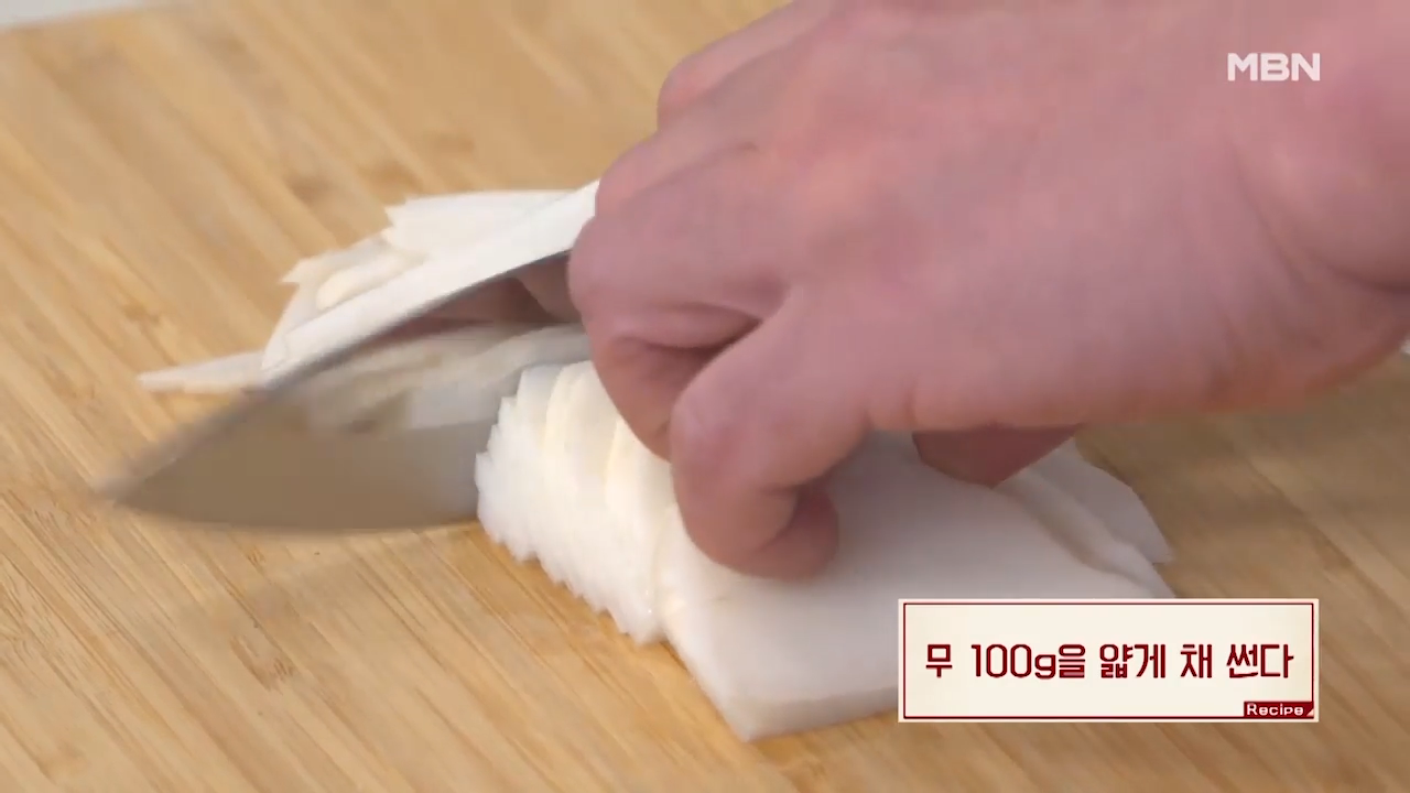▶무 100g을 얇게 채 썰어 줍니다.
