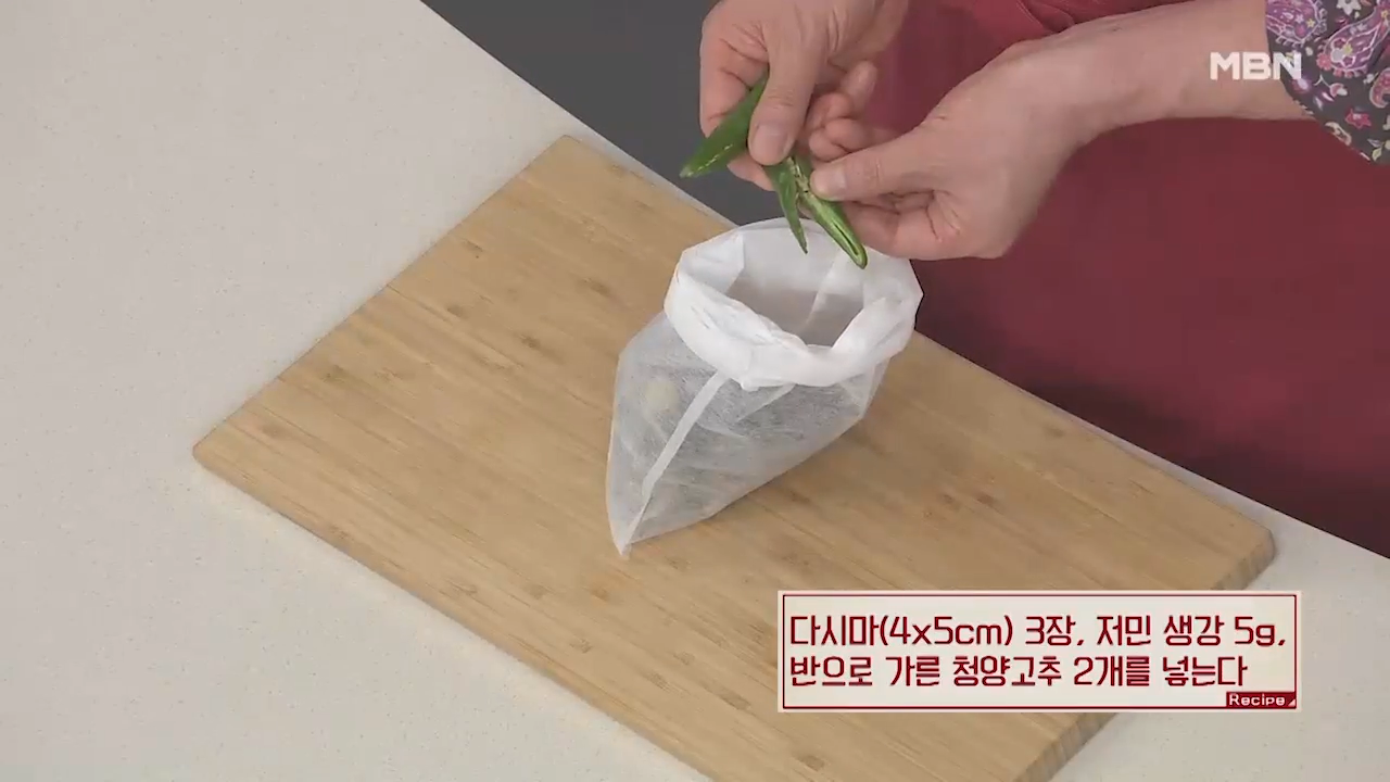 ▶다시마(4X5cm) 3장, 저민 생강 5g, 반으로 가른 청양고추 2개를 넣어줍니다.