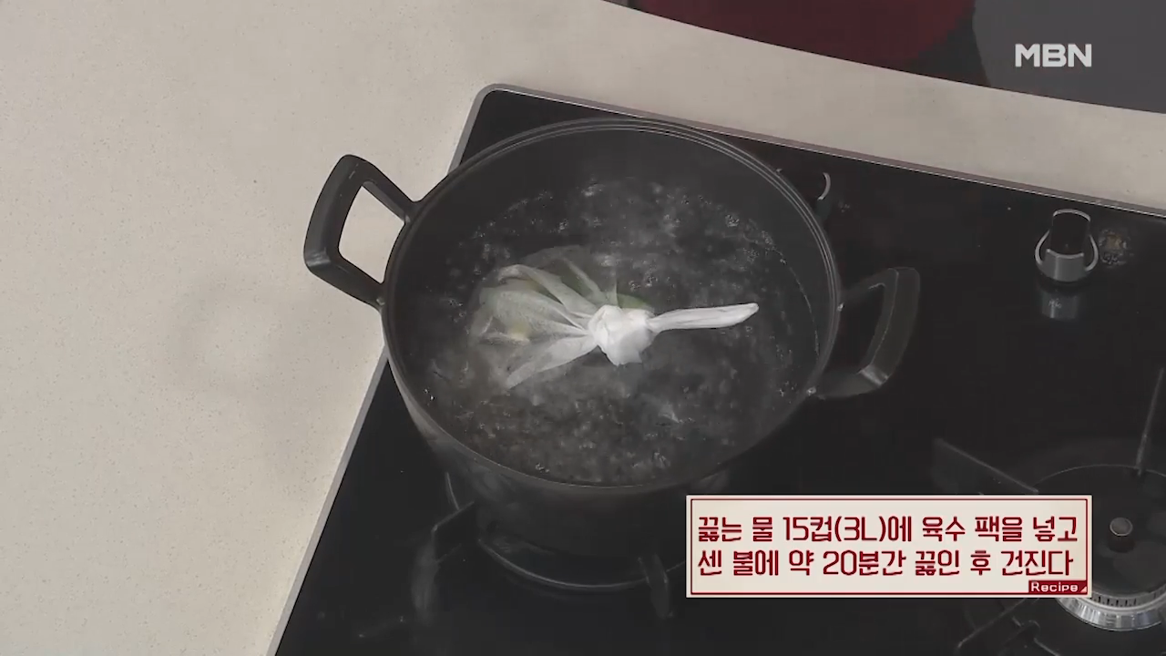 ▶끓는 물 15컵(3L)에 육수 팩을 넣고 센 불에 약 20분간 끓인 후 건져줍니다.