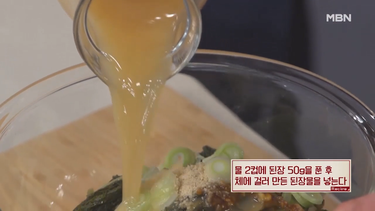 ▶물 2컵에 된장 50g 푼 후 체에 거른 된장 물을 넣어줍니다.