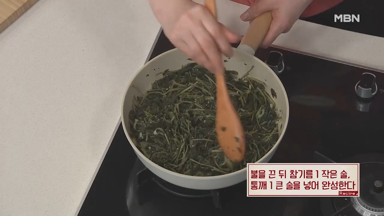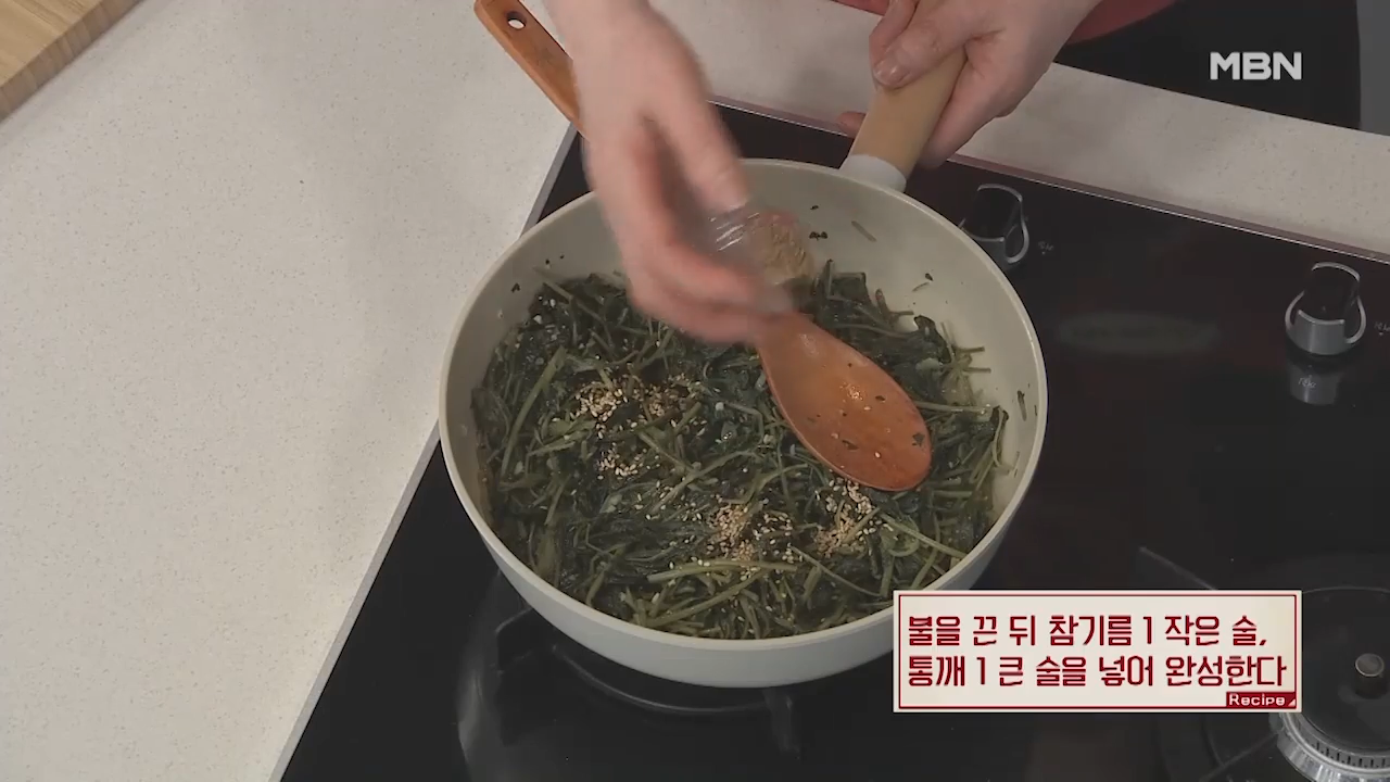 ▶불을 끈 뒤 참기름 1작은술, 통깨 1큰술을 넣어줍니다.