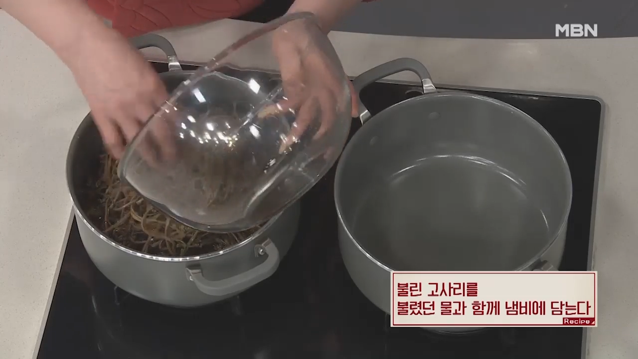 ▶불린 고사리를 불렸던 물과 함께 냄비에 담아줍니다.