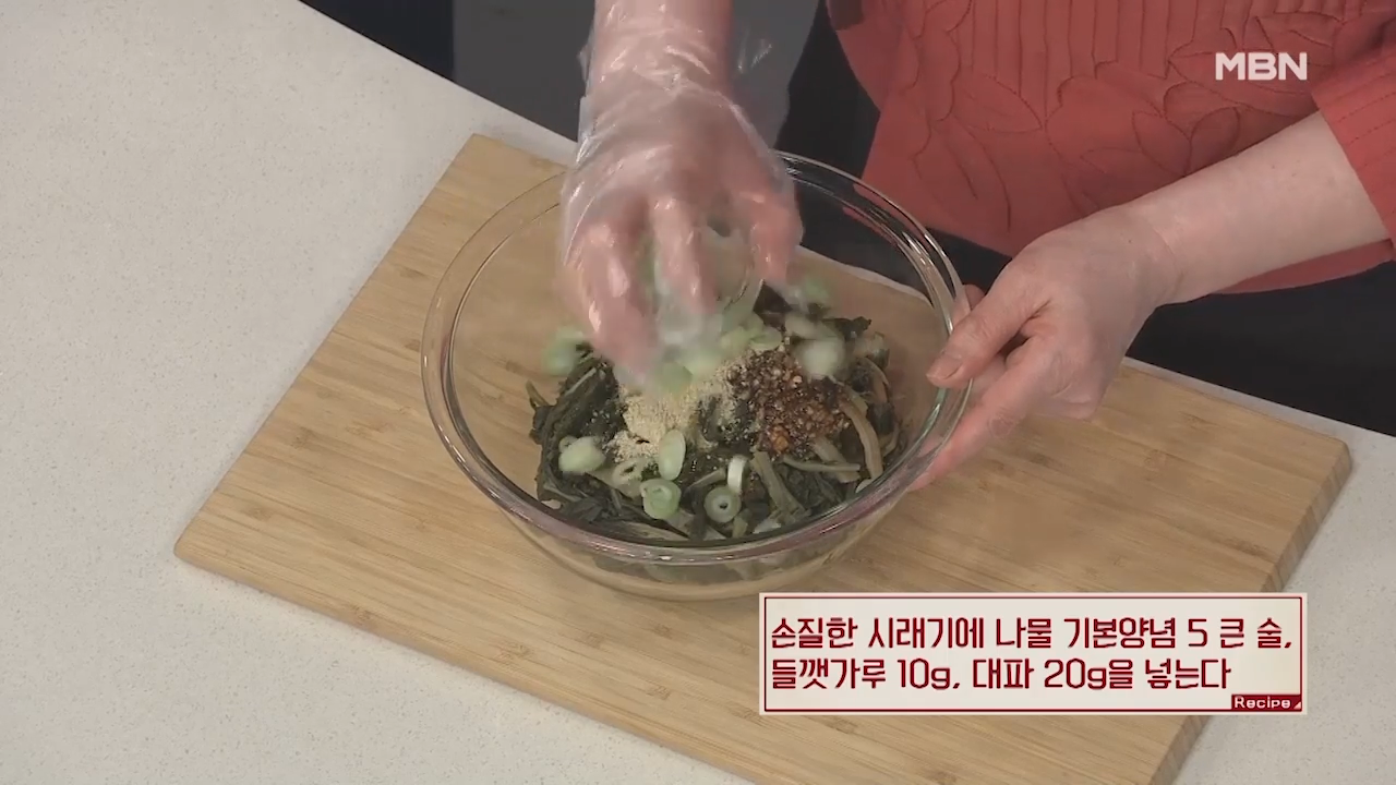 ▶손질한 시래기에 나물 기본양념 5큰술, 들깻가루 10g, 대파 20g을 넣어줍니다.