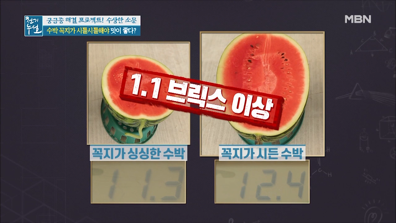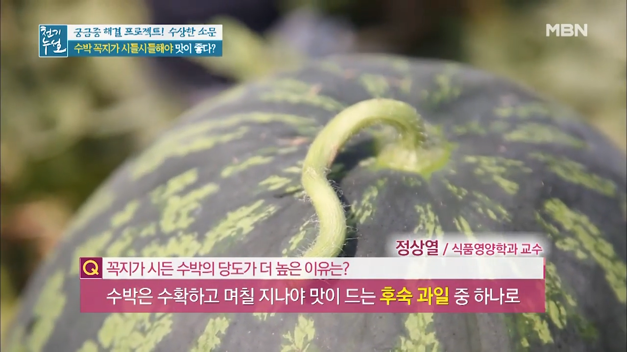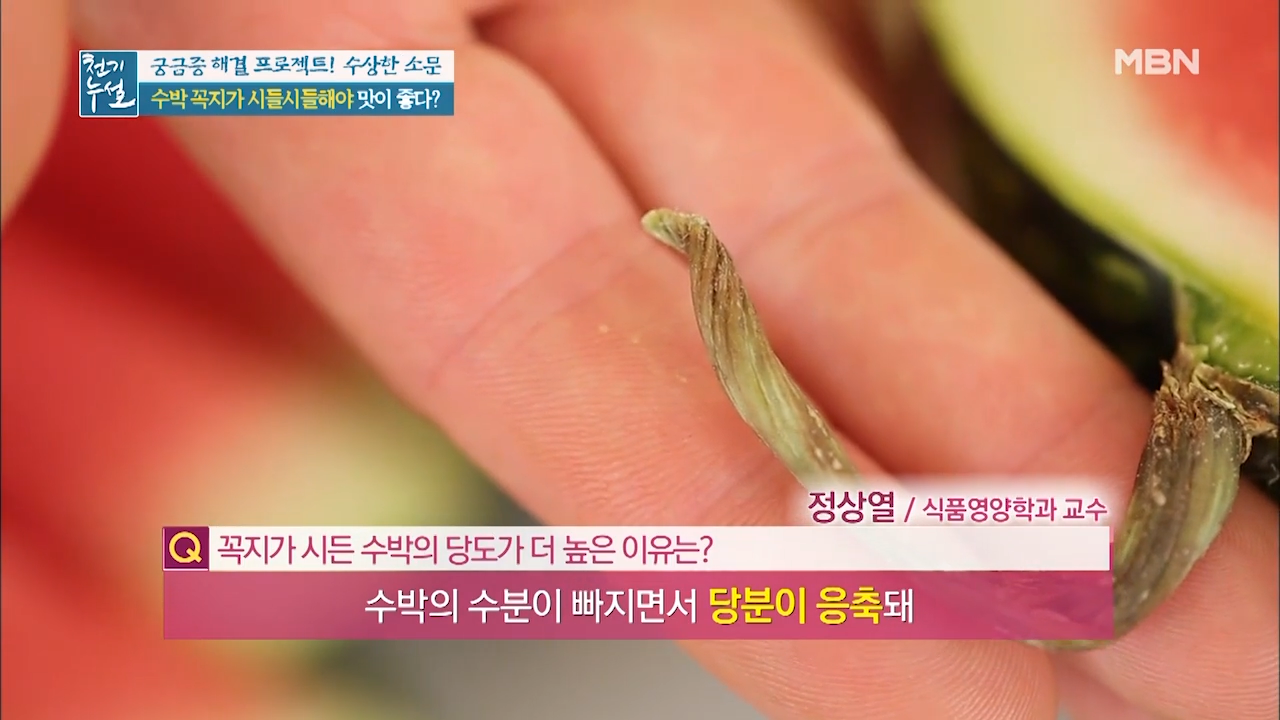 수박은 수확한 후에 숙성되는 과일로 꼭지를 통해 숨을 쉬는 수박이 꼭지를 통해 수분을 날려 보낸 것입니다. 때문에 꼭지가 시들해졌다면 수박에서 수분이 빠지면서 당분이 응축돼 단맛이 강해진 것입니다.