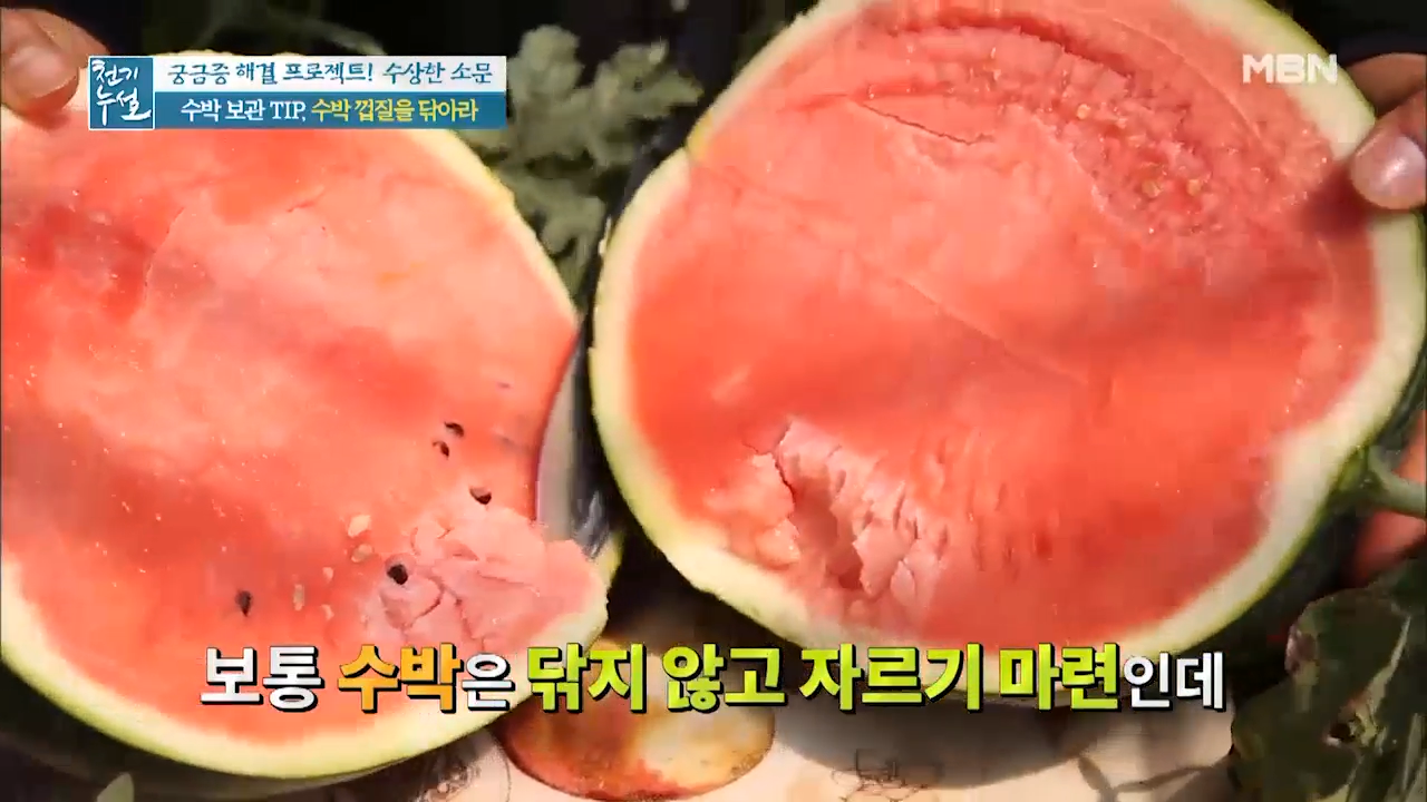수박이 껍질을 깨끗이 닦아 통재로 보관하는 것입니다. 잘라서 보관할 경우에도 껍질을 깨끗이 닦아 보관합니다.