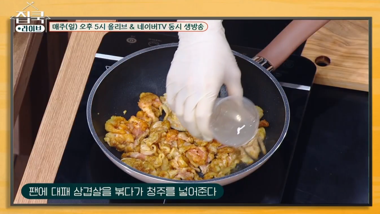 ▶대패 삼겹살을 볶다가 청주 반(1/2) 컵을 넣어 단맛을 더해 줍니다.