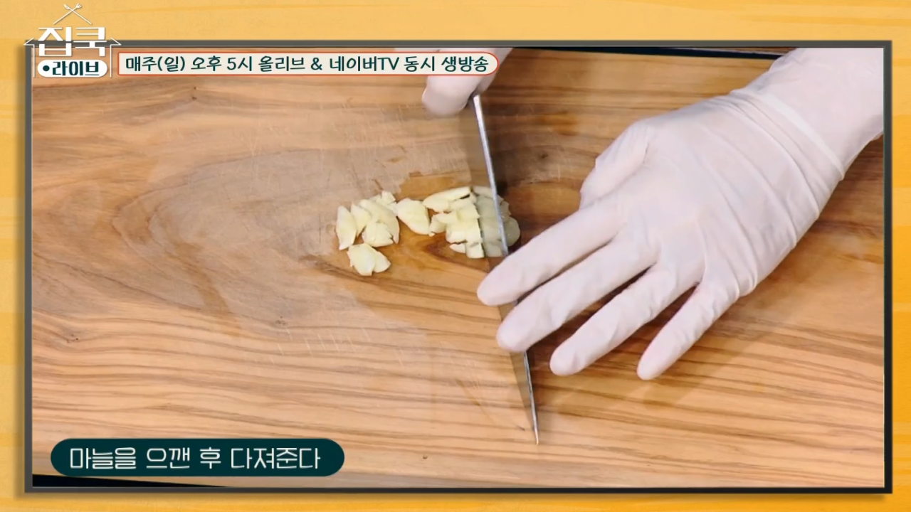 ▶깐 마늘 3개를 으깬 후 다져줍니다.