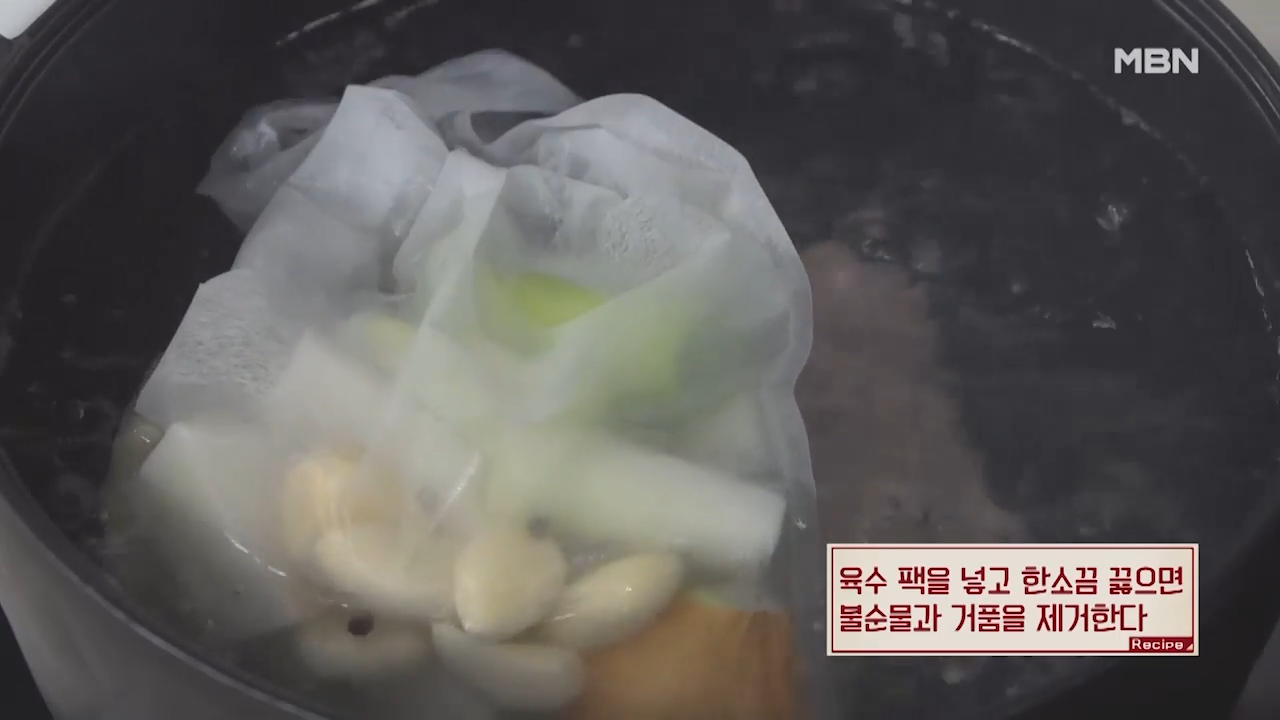 맑은 국물을 위해 육수에 뜬 불순물과 거품을 제거합니다.