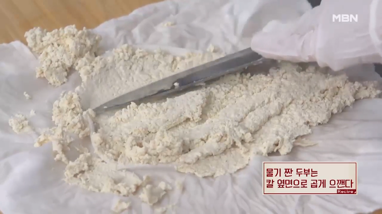 ▶물기 짠 두부는 칼 옆면으로 곱게 으깨줍니다.