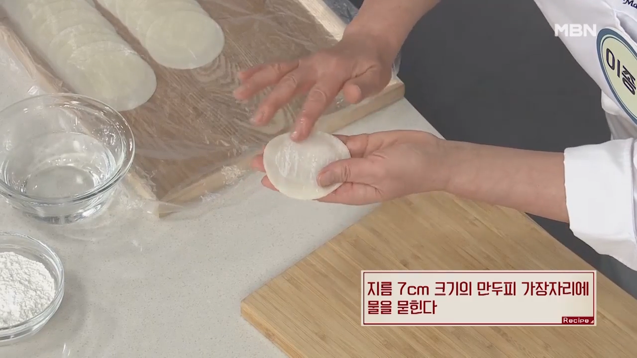 ▶만두피 가장자리에 물을 묻혀 줍니다.