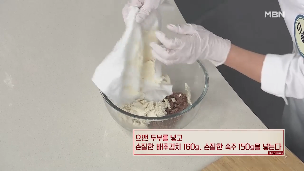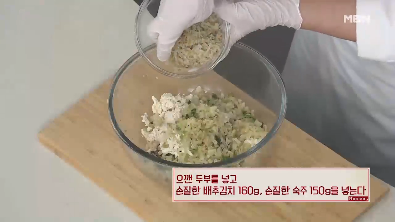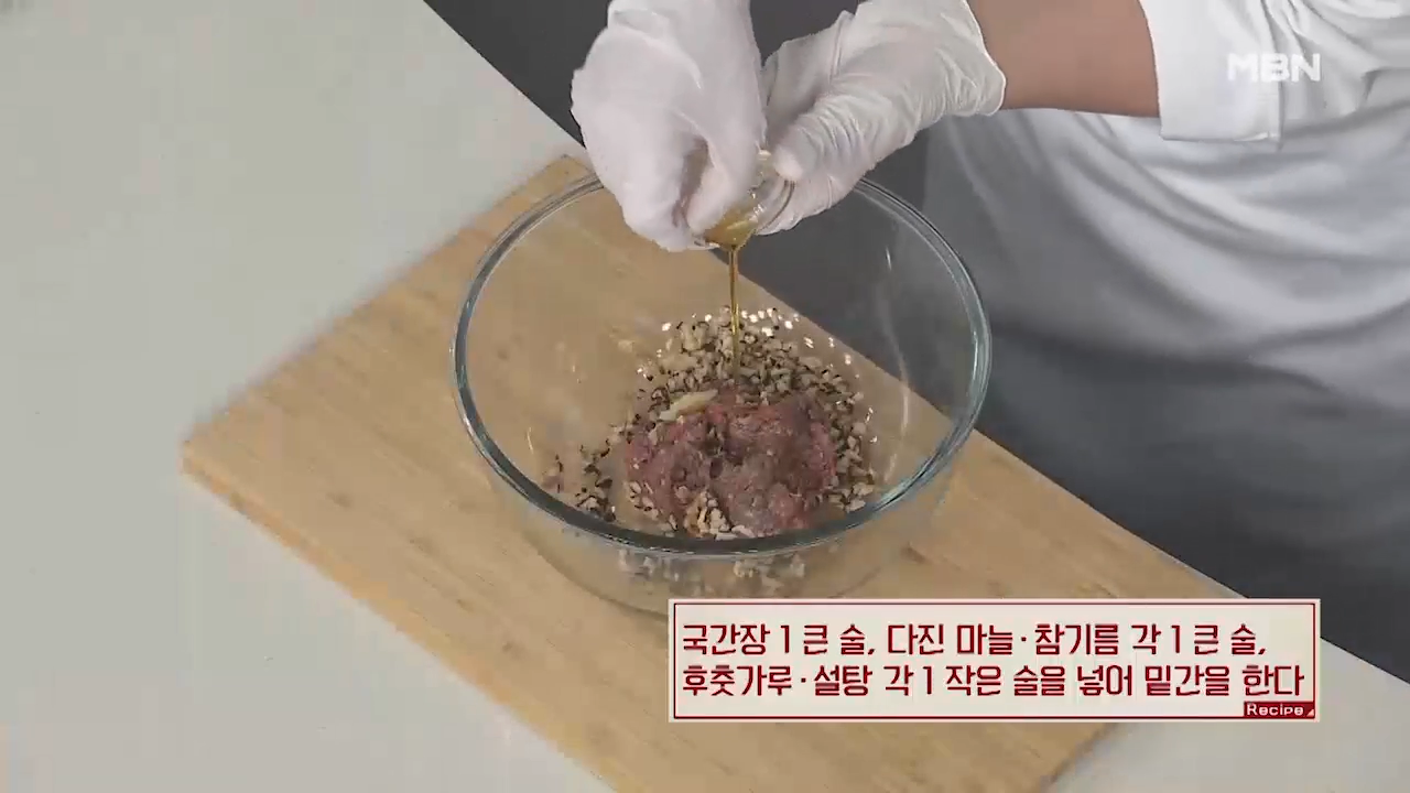 ▶으깬 두부를 밑간 한 소고기 우둔살에 넣어줍니다.