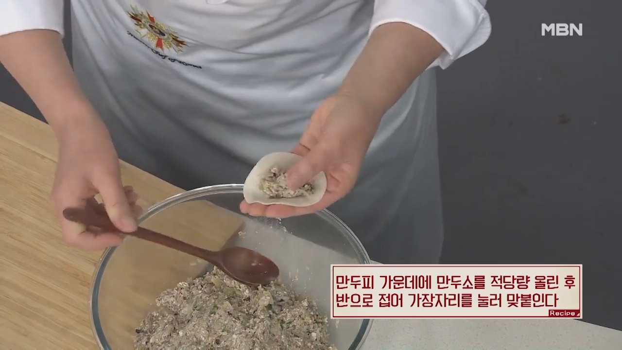 ▶만두피 가운데 만두소를 적당량 올려줍니다.