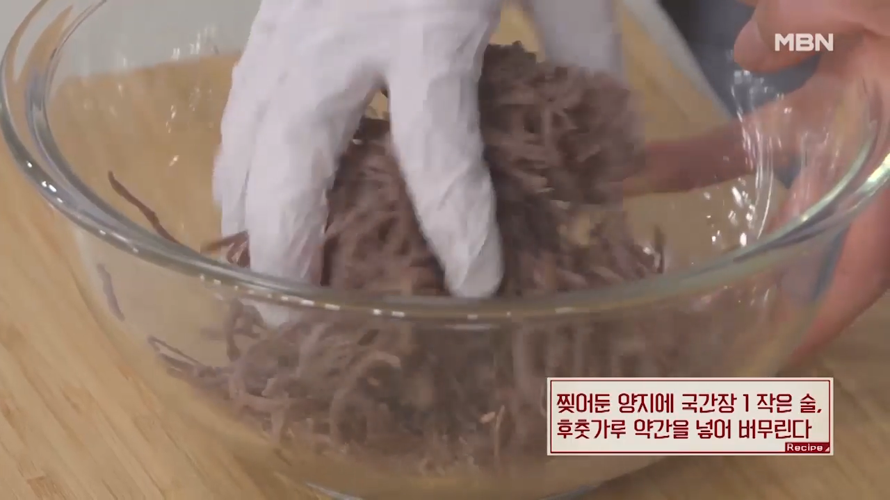 ▶찢어둔 양지에 국간장 1작은술, 후춧가루 약간을 넣어 버무려줍니다.