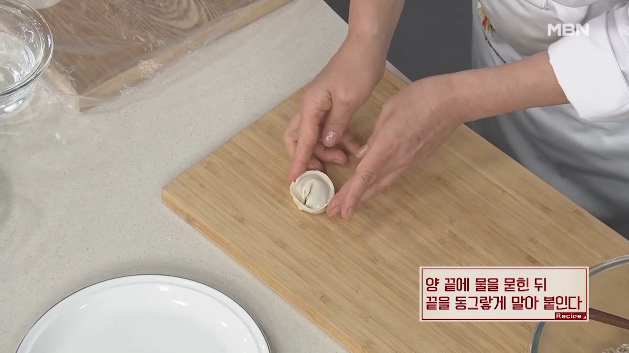 ▶양 끝에 물을 묻힌 뒤 끝을 동그랗게 말아 붙여줍니다.