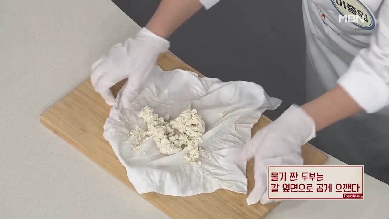 ※데친 두부를 면포에 담아 물기를 꼭 짜줍니다.