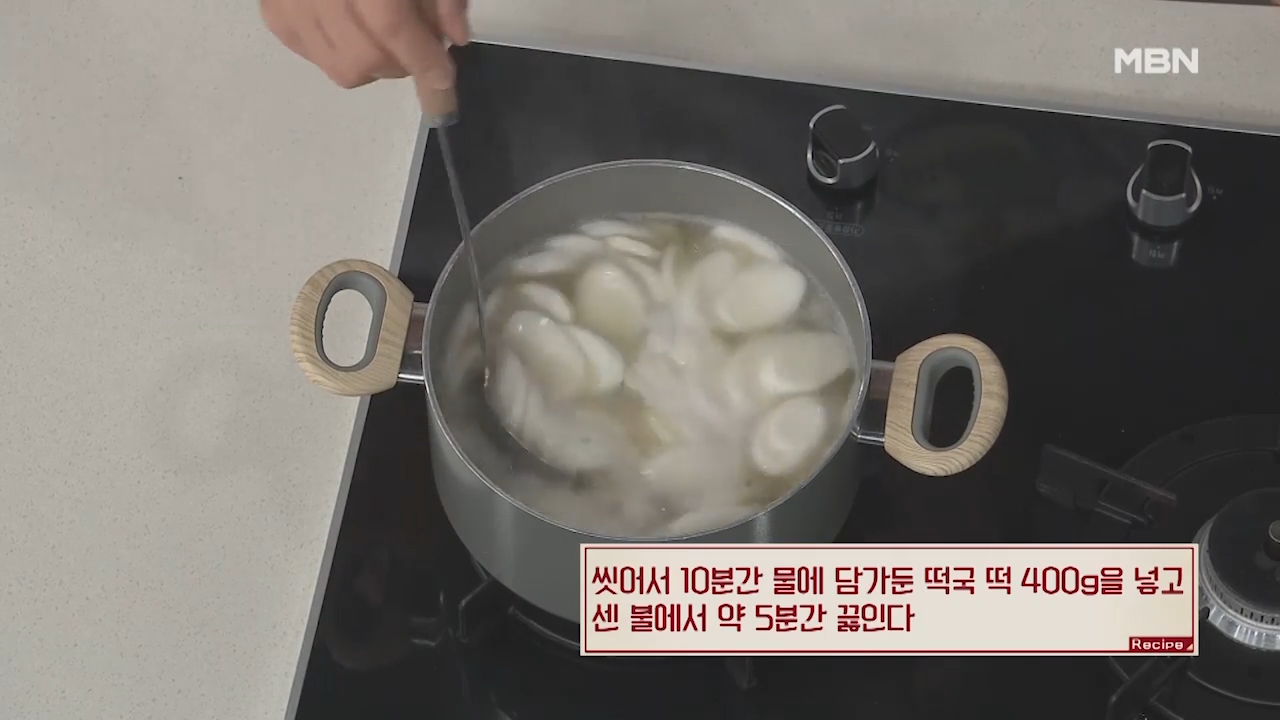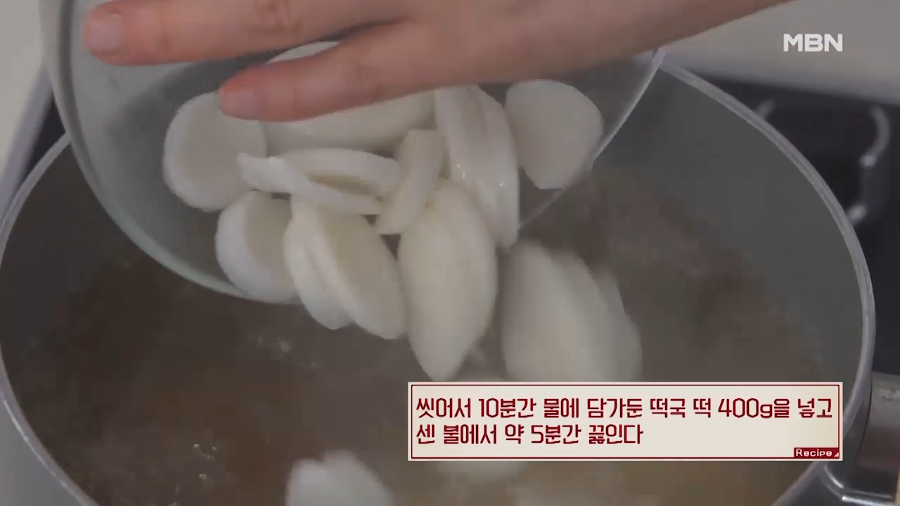 ▶씻어서 10분간 물에 담가 둔 떡국 떡 400g을 넣고 센 불에서 약 5분간 끓여줍니다.