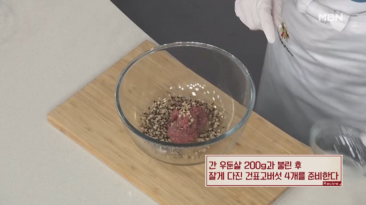 건표고버섯 4개를 따뜻한 물에 30~40분간 불린 뒤 잘게 다져 물기를 제거합니다.