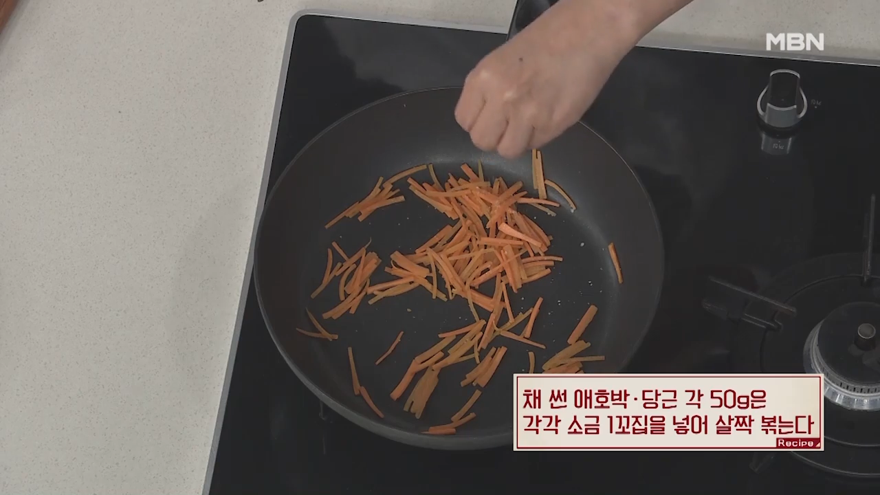 ▶채 썬 애호박, 당근 각 50g은 각각 소금 1꼬집을 넣어 살짝 볶아줍니다.
