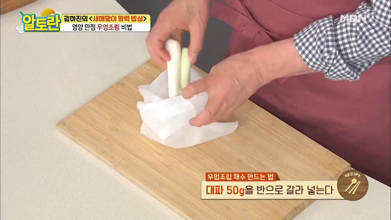 ▶대파 50g을 반으로 갈라 넣어줍니다.
