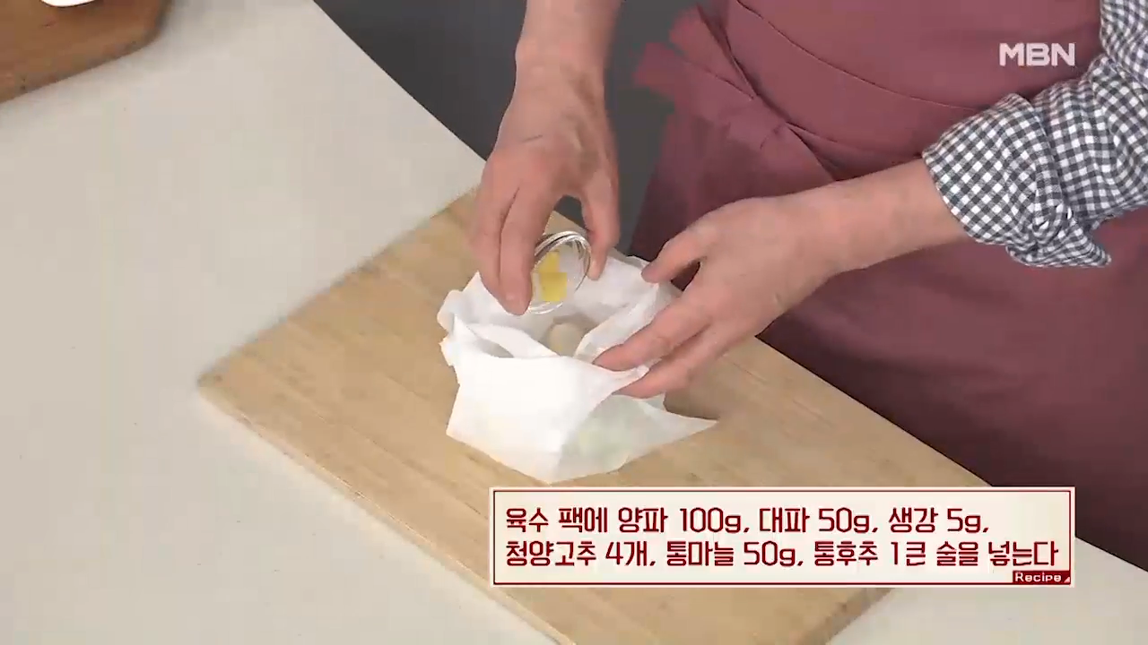 ▶육수 팩에 양파 100g을 넣어줍니다.