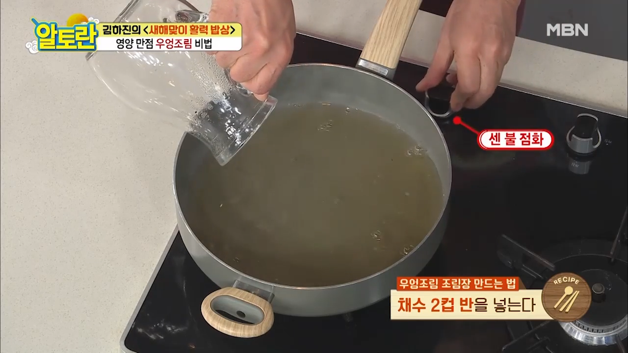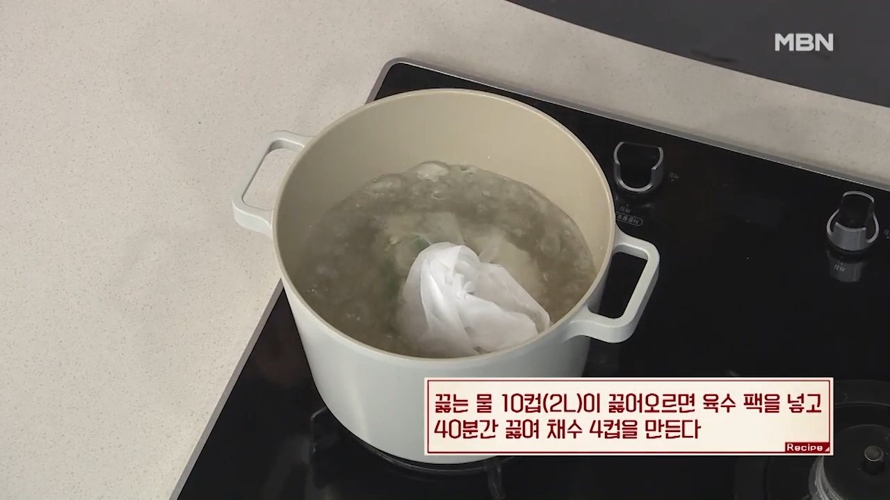 ▶센 불에 채수 2컵 반을 넣어줍니다.