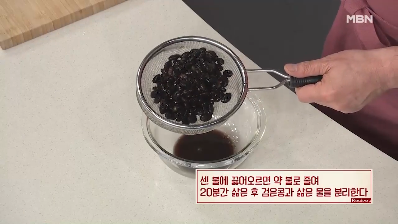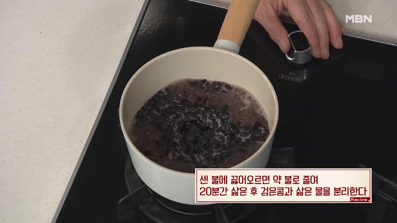 ▶센 불에 끓어오르면 약 불로 줄여 20분간 삶은 후 검은콩과 삶은 물을 분리합니다.