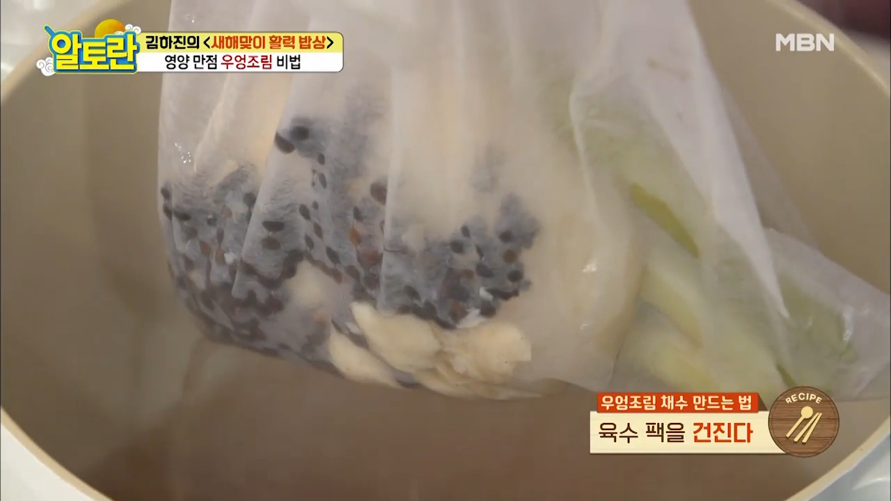 ▶40분 경과 후 육수 팩을 건져 줍니다.