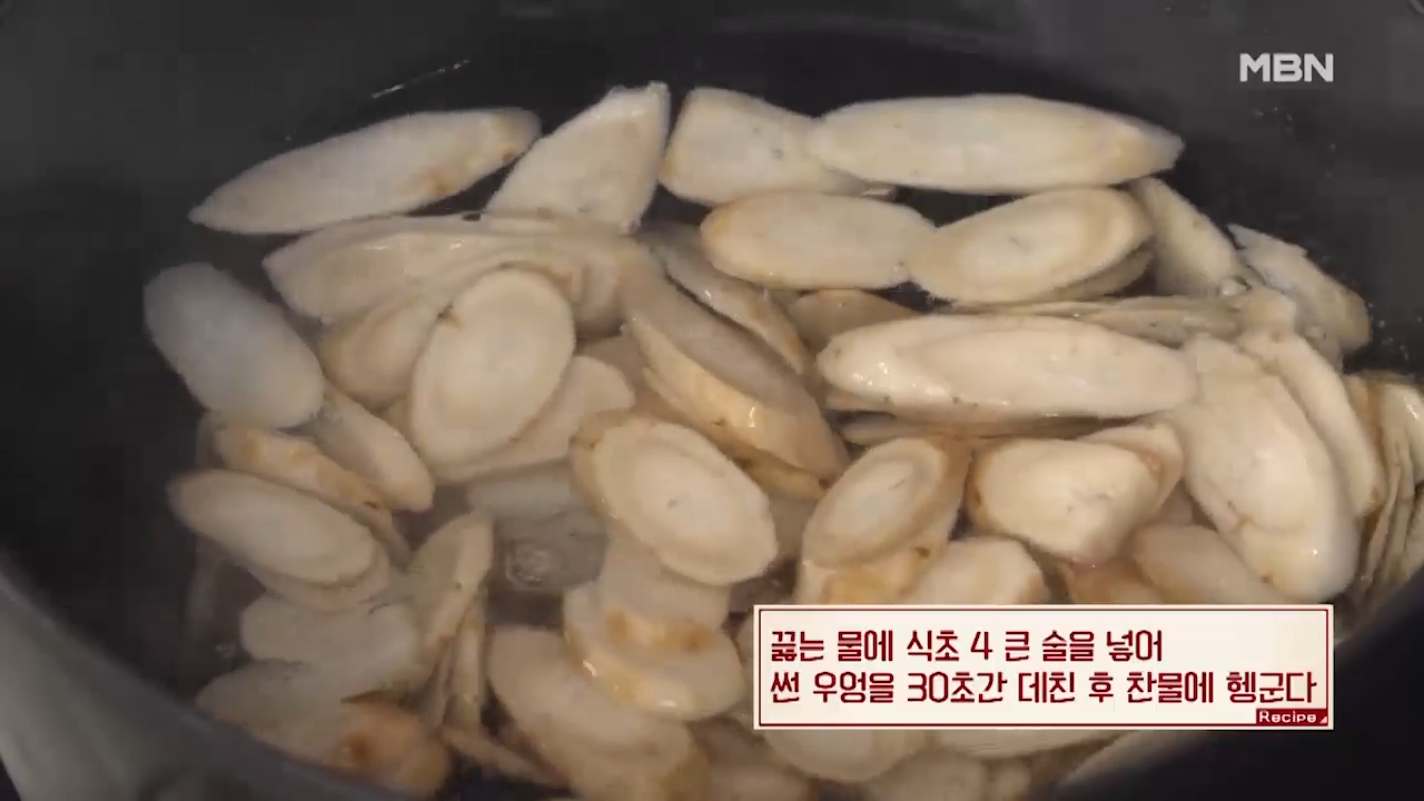 ※우엉의 아린 맛을 제거하기 위해 식초물에 데쳐 줍니다.