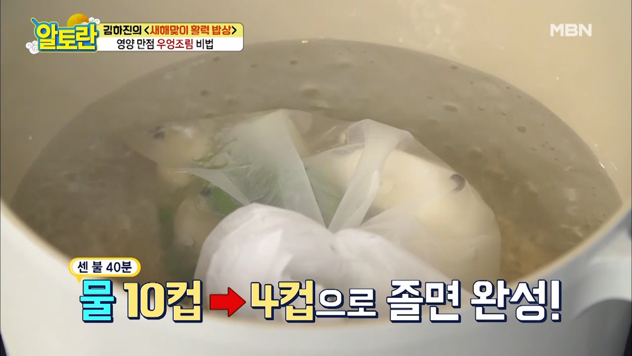 ▶센 불에서 40분간 끓여 물 10컵이 4컵으로 졸 때까지 끓여줍니다.
