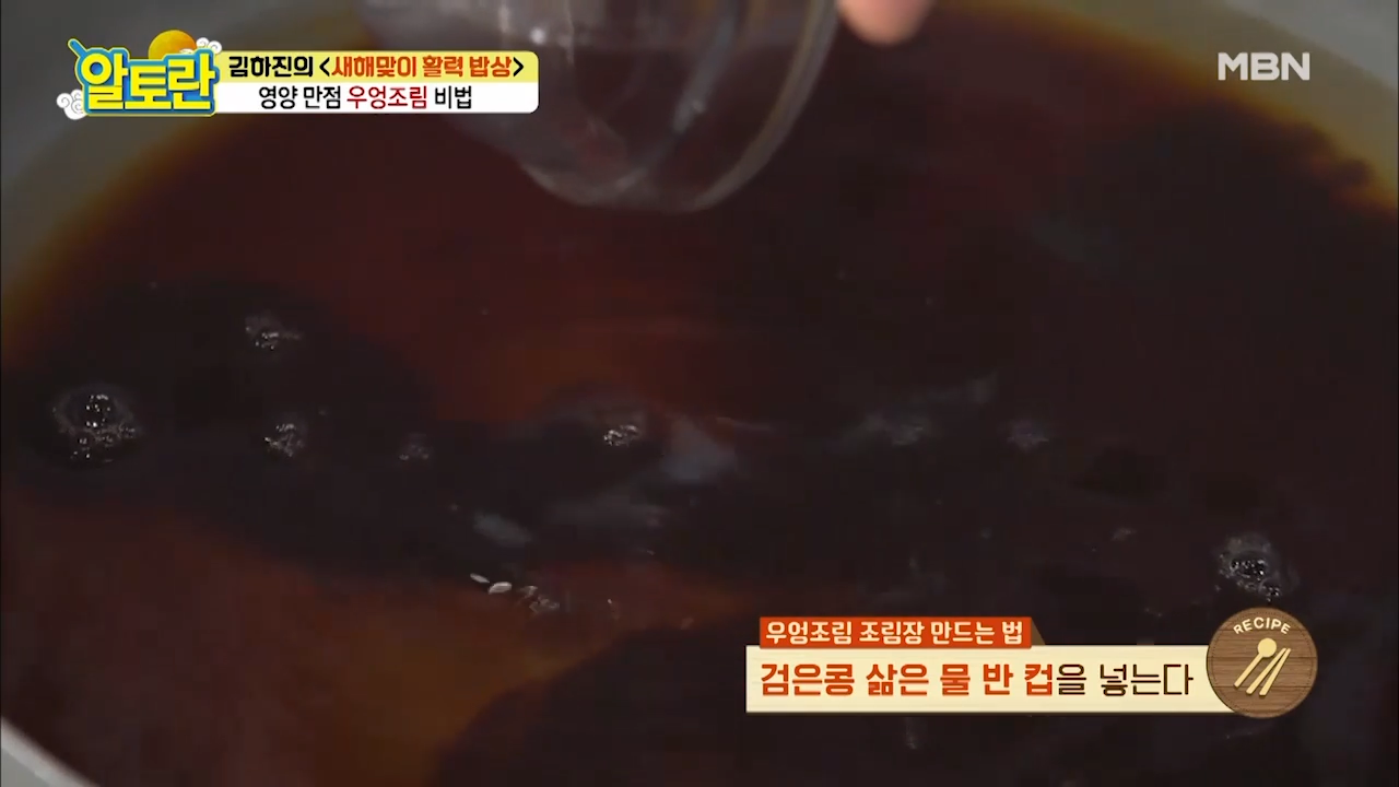 ▶검은콩 삶은 물 반 컵을 넣어줍니다.