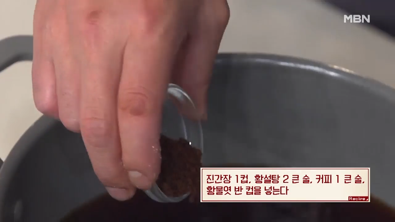 ①진간장 1컵, 황설탕 2큰술, 커피 1큰술, 황물엿 반 컵 넣기