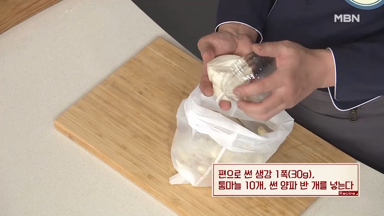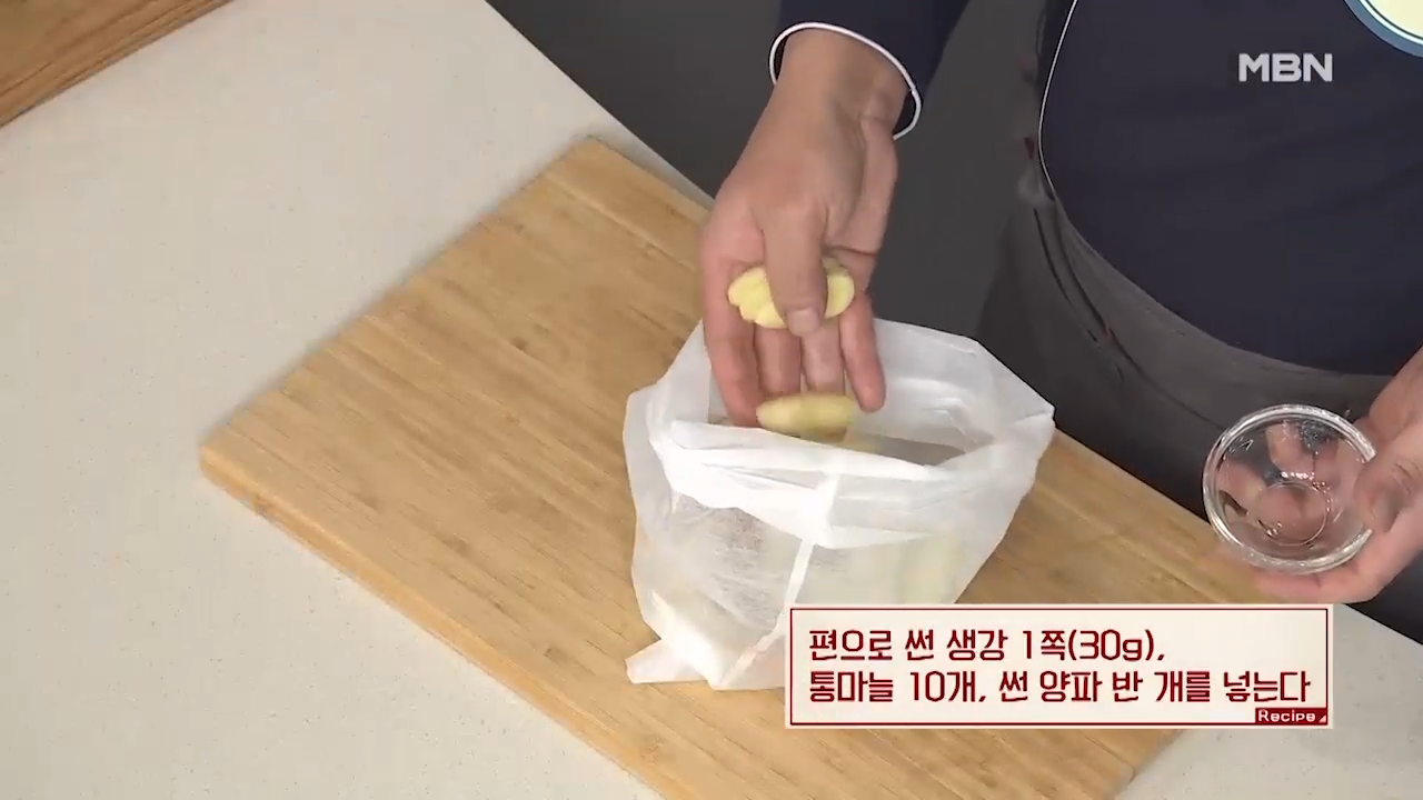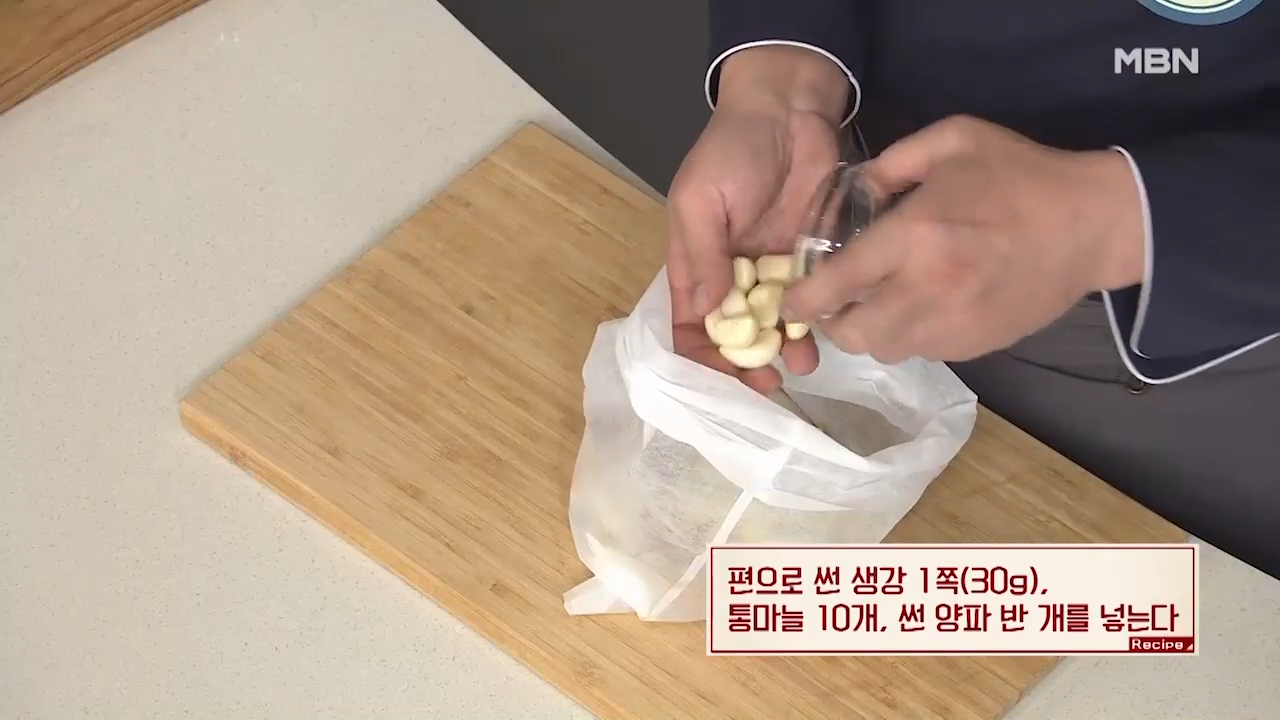 ▶편으로 썬 생강 1쪽(30g), 통마늘 10개를 넣어줍니다.