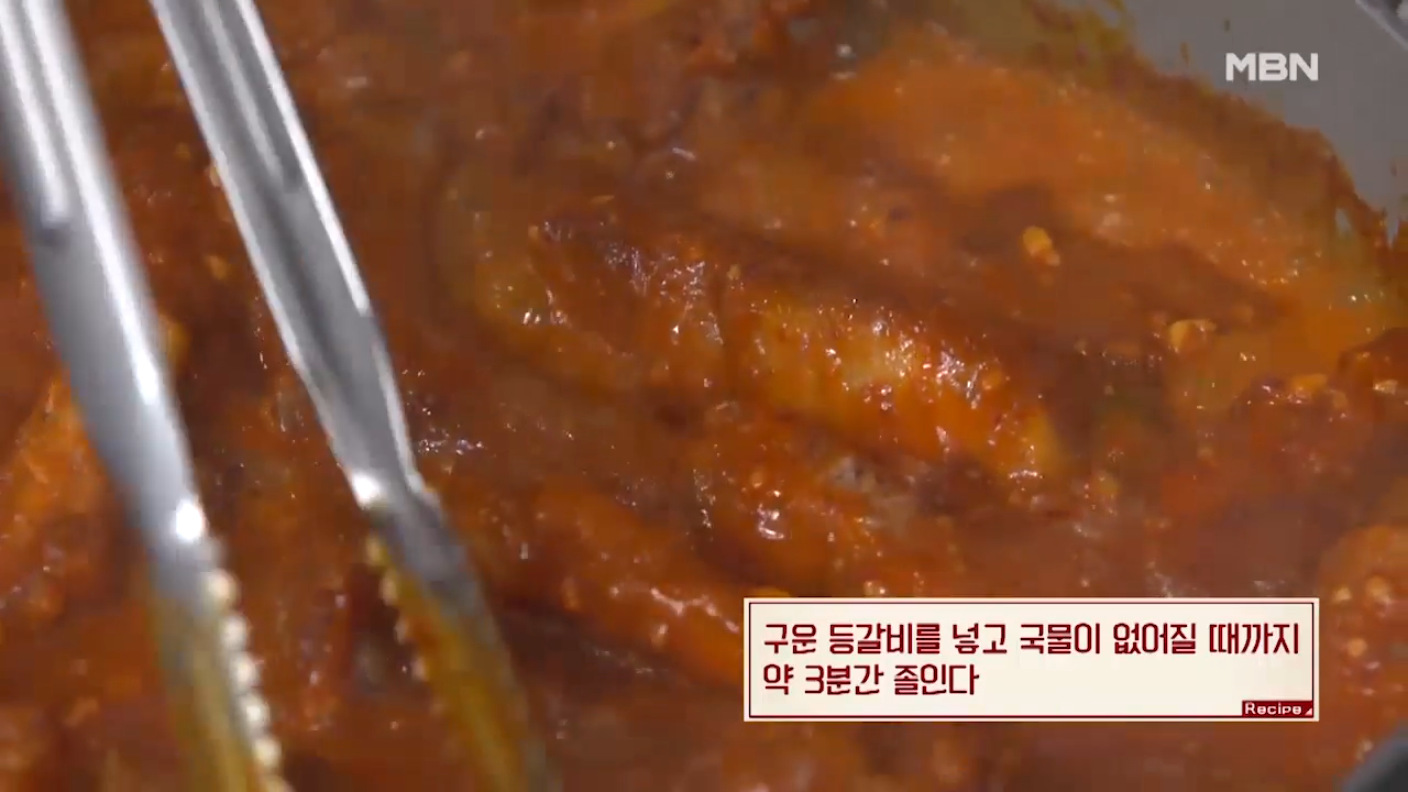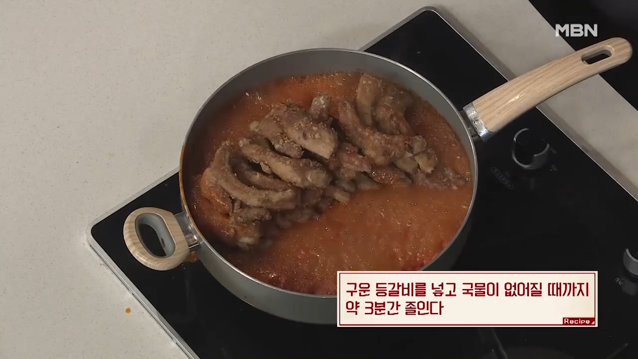 ▶1분간 끓인 양념장에 구운 등갈비를 넣고 국물이 거의 없어질 때까지 약 3분간 졸여 줍니다.