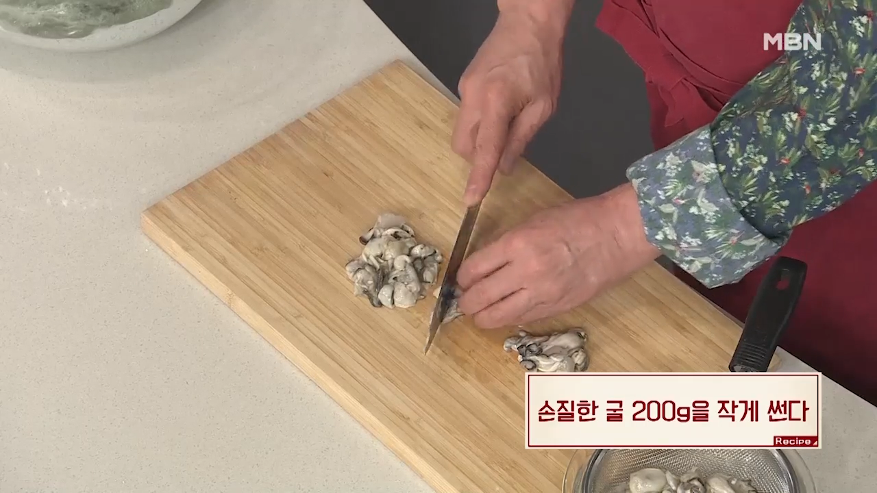 ▶굴 200g을 잘게 썰어줍니다. 기호에 따라 크기를 조절해가며 썰어줍니다.