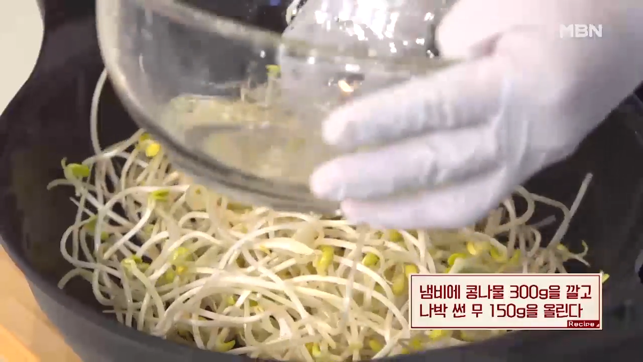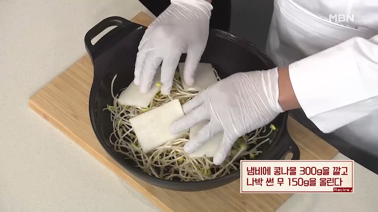 ▶냄비에 콩나물 300g을 깔아줍니다.