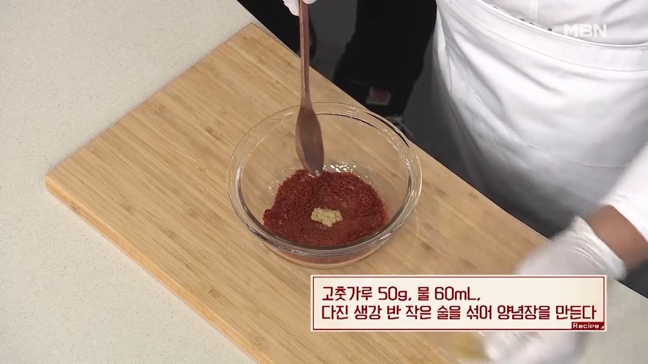 ▶고춧가루 50g, 물 60mL, 다진 생강 반 작은 술을 섞어 양념장을 만들어 줍니다. 만든 양념장은 냉장고에 넣고 1~2시간 간 숙성시켜 줍니다.