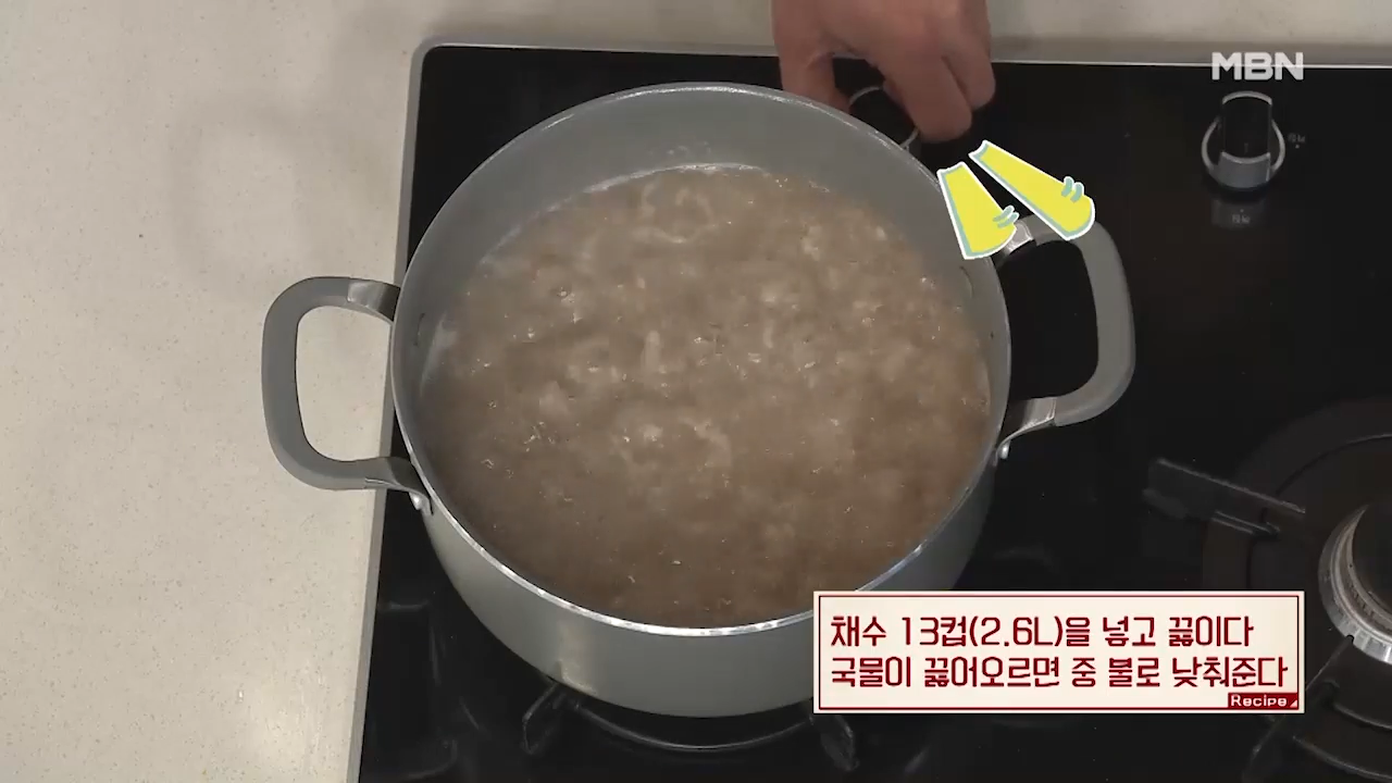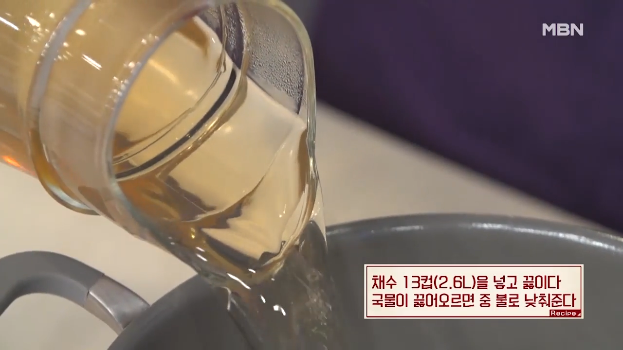 ▶채수 13컵(2.6L)을 넣고 끓이다 국물이 끓어오르면 중 불로 낮춰 줍니다.
